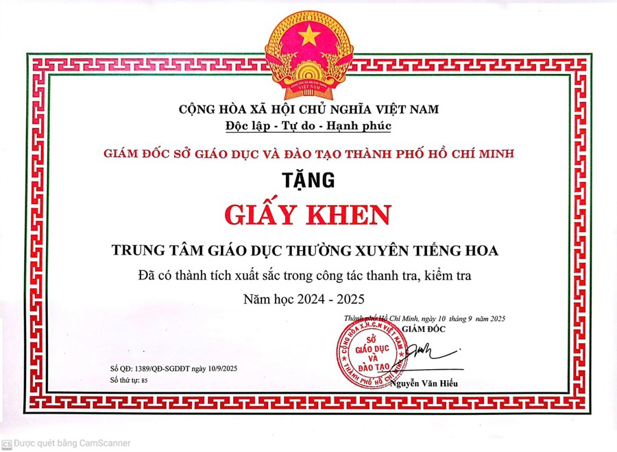 Ngày 16 tháng 9 năm 2025, Sở Giáo dục và Đào tạo đã tổ chức Hội nghị Tổng kết công tác thanh tra, kiểm tra năm học 2024-2025 và triển khai nhiệm vụ công tác kiểm tra, pháp chế năm học 2025-2026. Trung tâm GDTX Tiếng Hoa vinh dự được nhận Giấy khen “Đã có thành tích xuất sắc trong công tác thanh tra, kiểm tra năm học 2024 – 2025”. Đây là nguồn động viên, khích lệ trung tâm làm tốt hơn nữa trong năm học mới.